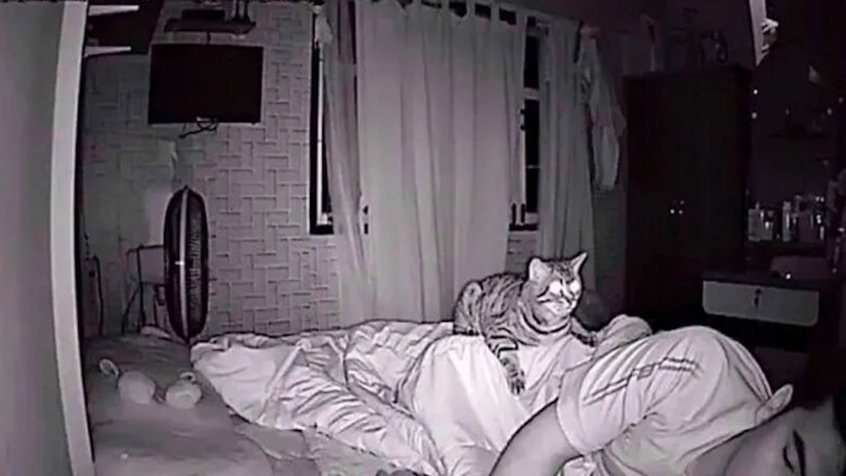 Kayıtlar, şaşırtıcı bir görüntüyü ortaya çıkardı: Daniel ve eşi uyurken Muffins sadece bakmıyor, aynı zamanda Daniel’ın yüzüne tırmanıyor, nefes almasını engelliyordu.